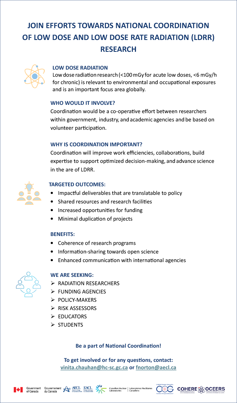 The vision of national coordination is to build on the existing work of low dose radiation research groups in Canada, to identify priorities for future initiatives, and to enable a structured coordination of Canadian research programs by bringing together government, industry and academic partners. Please refer the poster below for more information.
